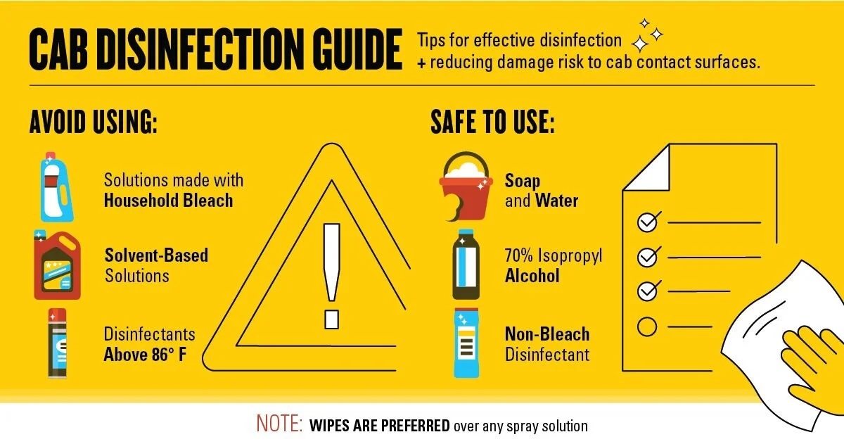 Disinfecting the equipment you’re running has now become an important part of your daily routine on the job-site. My friends at Caterpillar sent me a few tips on best practices when it comes to keeping the fleet clean & safe. Also check out their recommended products below!
